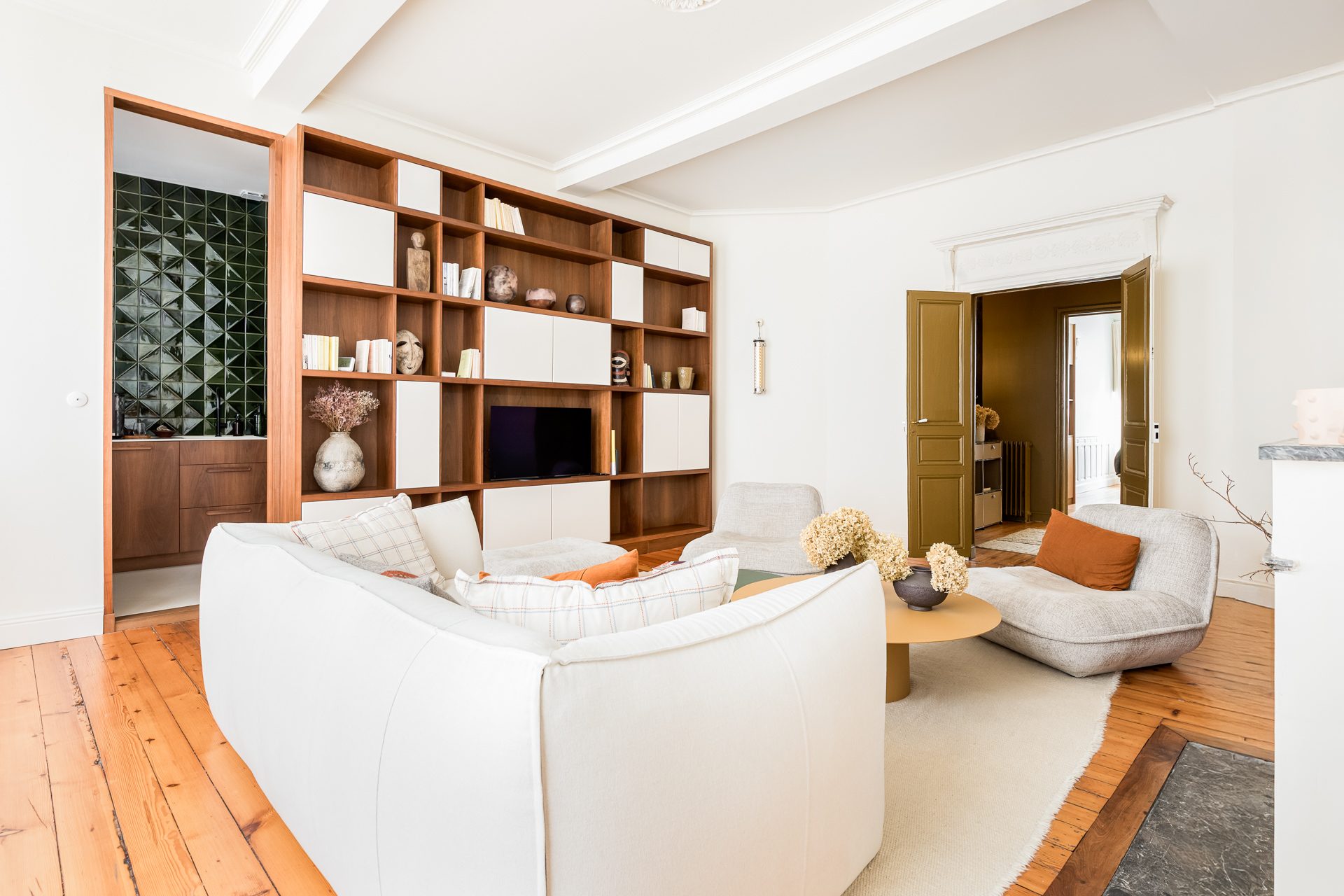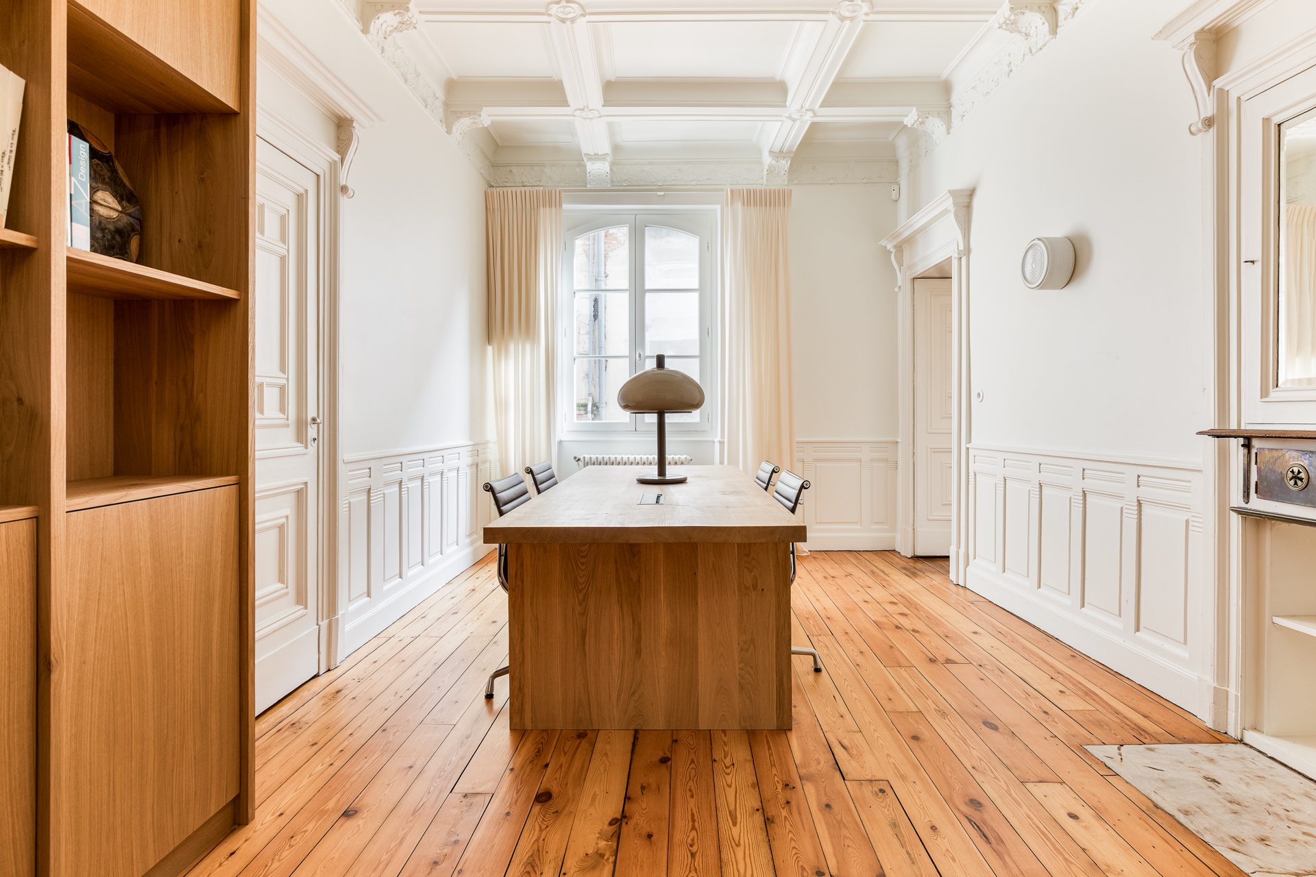 Les codes architecturaux de l’époque ont été soigneusement conservés et sublimés : cheminées d’origine, plafonds à caissons , parquets anciens, créant une parfaite harmonie entre charme historique et confort contemporain.