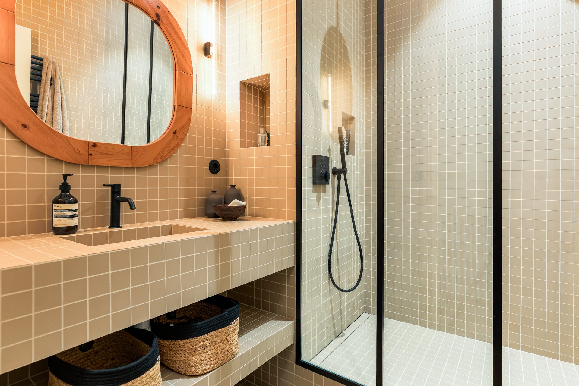 L’espace nuit se compose de trois chambres, dont une suite avec salle d’eau privative, ainsi qu’une seconde salle d’eau destinée aux deux autres chambres.