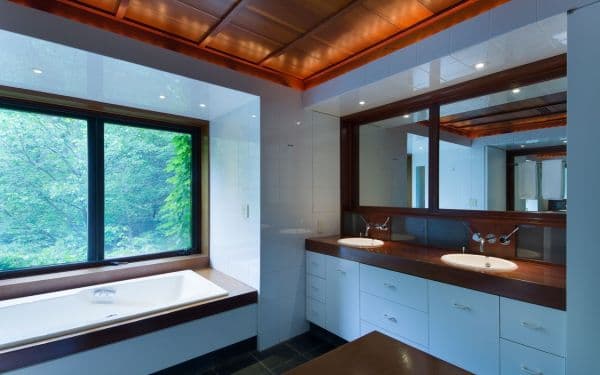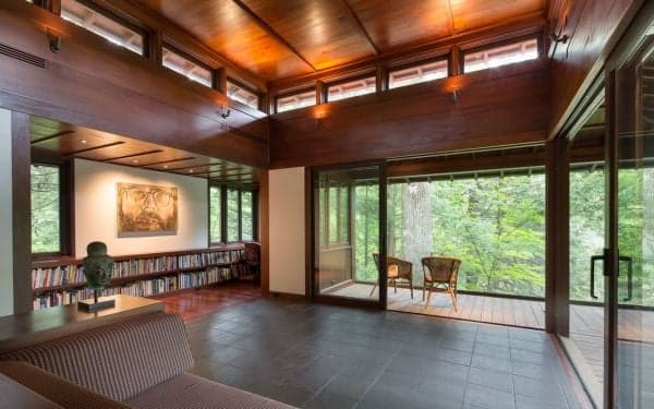 La maison est conçue en quatre pavillons de bois, reliés les uns aux autres par une série de passages abrités. La résidence principale donne sur la cascade avec une cuisine ouverte, un espace salon et salle à manger aux portes coulissantes surplombant rivière et chutes d’eau. Cette même maison centrale comprend une suite parentale, deux chambres supplémentaires, un espace cinéma et de nombreux clins d’oeil à l’oeuvre de Wright, comme les toits-plats, l’utilisation importante du bois…