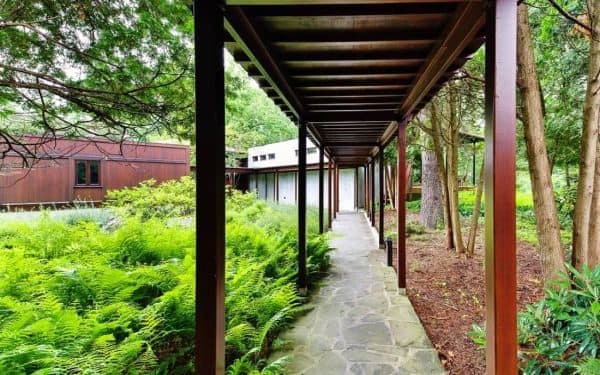 Fortement inspirée de la « Fallingwater House » (maison sur la cascade), l’une des plus célèbres réalisations de l’architecte Franl Lloyd Wright, cette maison contemporaine se situe dans l’Etat de New York, à quelques encablures de l’Hudson river et de la ville de Rhinebeck.