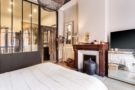 Les plafonds atteignant près de quatre mètres, les moulures délicates et la cheminée en marbre, toujours en fonctionnement grâce à un insert, confèrent à cet intérieur une élégance intemporelle. L’esprit haussmanien dialogue avec des aménagements contemporains soigneusement choisis, à l’image de la cuisine ouverte — un espace graphique et fonctionnel.